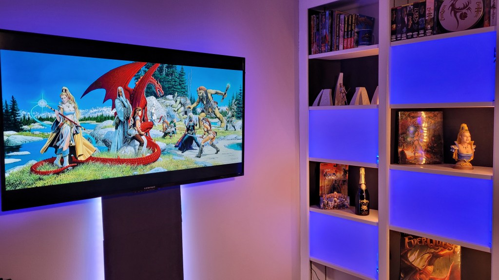 On the right of framing, various EverQuest items are placed in alternating shelves, between LED light box panels.