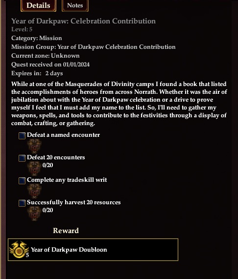 The Book of Deeds is a quest with many options. While it may be unclear, completing any one of these options completes the quest and rewards with 5x Year of Darkpaw Doubloons.