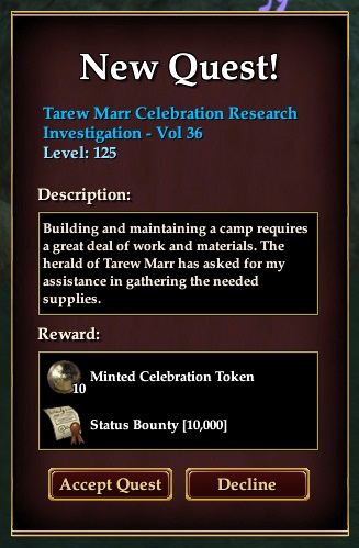 Description of the quest: Building and maintaining a camp requires a great deal of work and materials. The Herald of Tarew Marr has asked for my assistance in gathering supplies.
