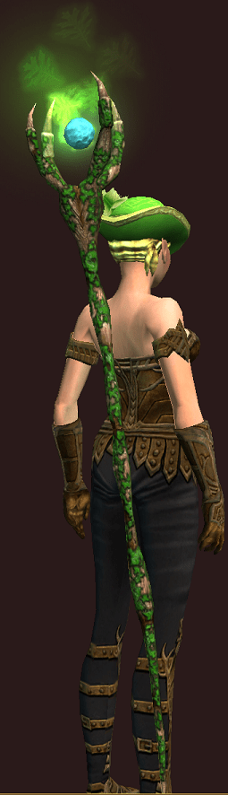 The wooden staff features vine texture on the wood and emits glowing green leaves when sheathed and engaged in battle.