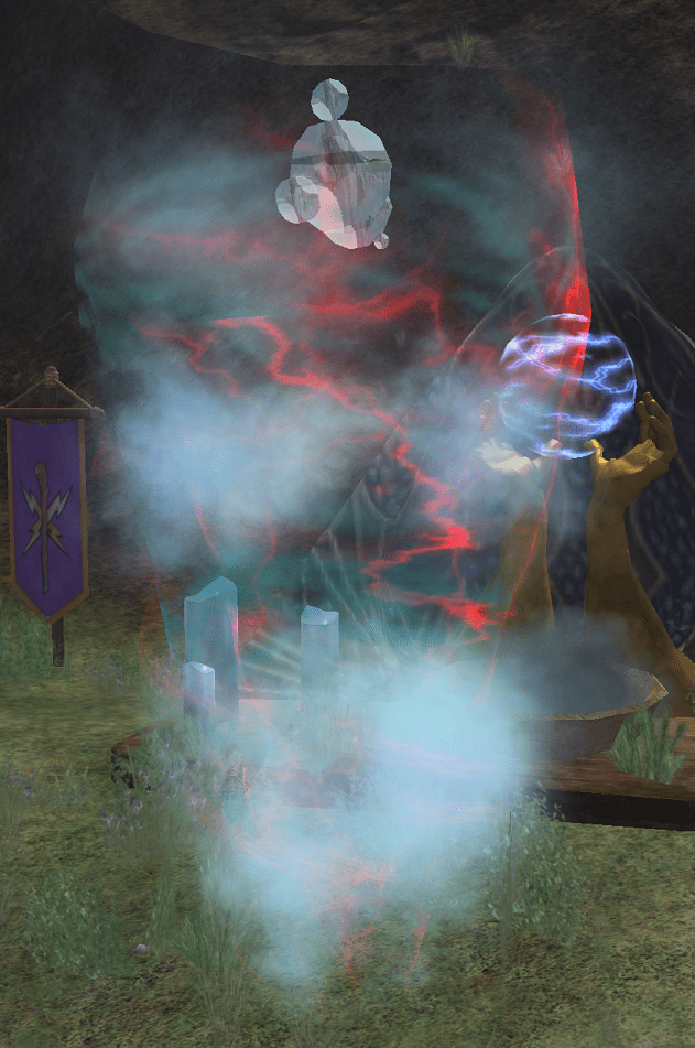 The Herald themself is a tempest of swirling winds and water standing in front of a large altar to Karana and flanked by two banners depicting the Stormlord’s sigil.