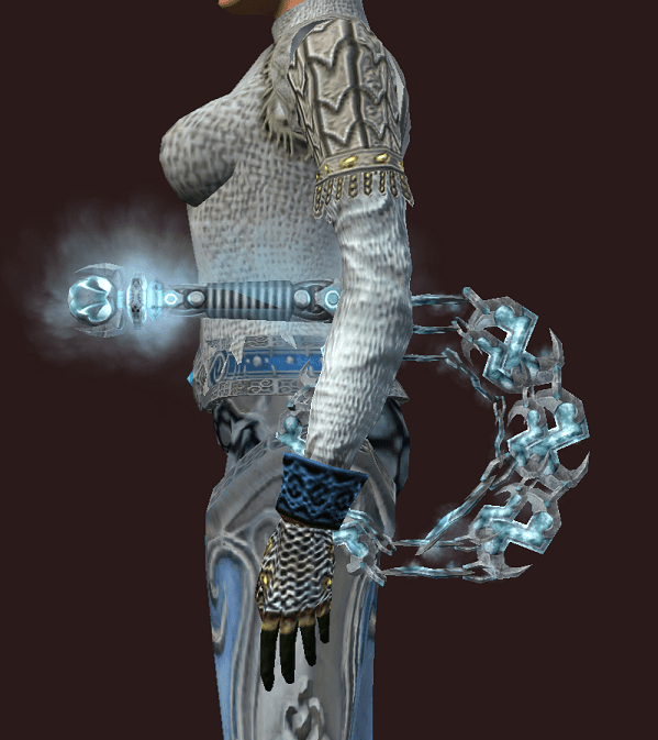 The Rainchain Whip of the Stormbringer is a one-handed crushing weapon with mist like water vapor surrounding it to give a storm effect.