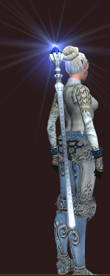 Stormbringer’s Archstaff is a two-handed crushing weapon, a claw holds a blue gem at the top of the staff. This gem emits a radiant blue light. Symbols or lettering is etched along the staff.