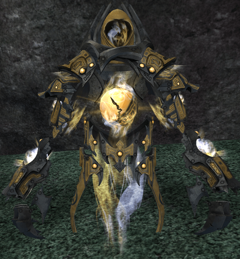 Same as Solusek-Ro, the Tribunal have sent a construct to act as their herald merchant. The merchant is faceless and wears a hood. Underneath the armour is a gold and blue glowing elemental with a large sphere in their centre.