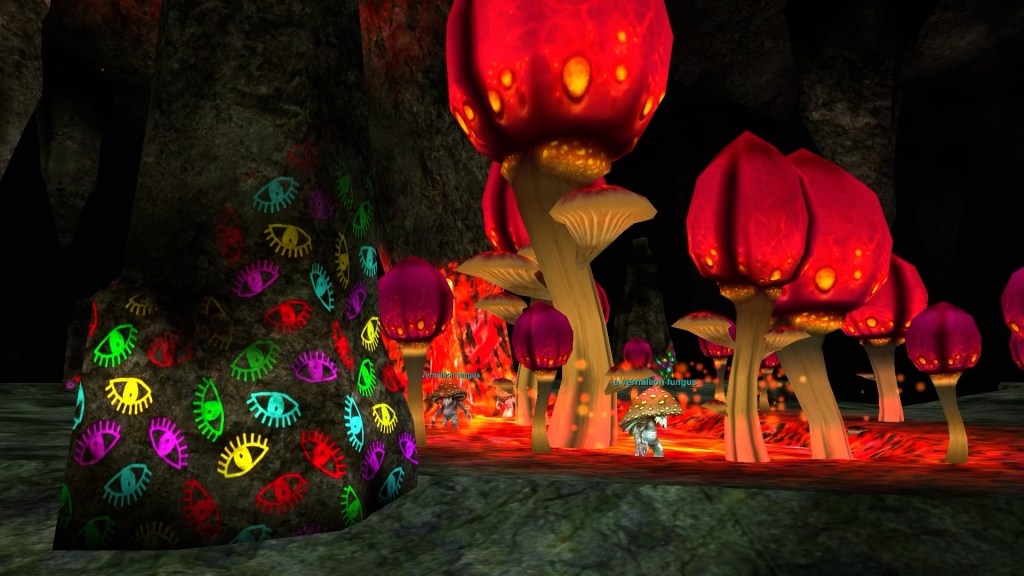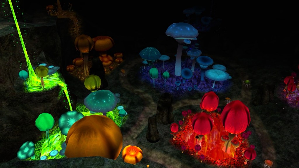 So you’re walking around and you’re on the top level, then you find a hole or you find another direction where to go for the story or you find the big hole and you’re like, wow, it’s a really pretty area because that’s where all those mushrooms are that are, that are colored.