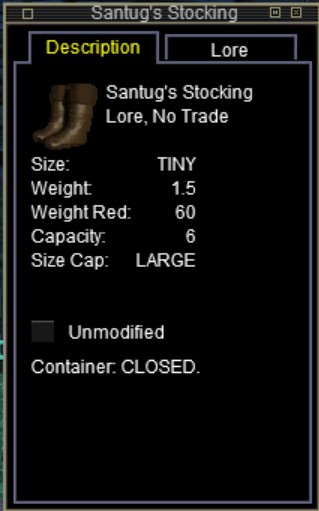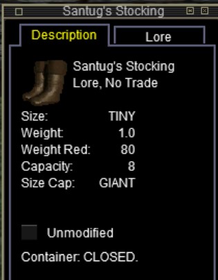 If you completed stage one of this task before December 15th you will have your “Santug’s Stocking” which is currently a small 2-slot bag.