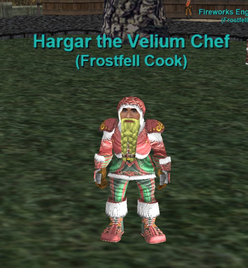 This quest is started by speaking with Hargar the Velium Chef (Frostfell Cook) who will be near the Santug of your choice in any main city. Hail him and follow the [baker] option of dialogue (you can also pick up the fishing quest at this time if you choose).