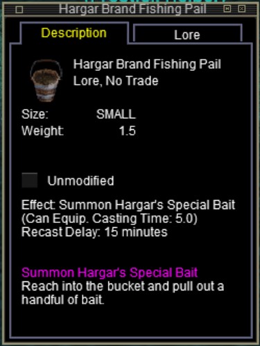 Once you have 4 of all 5 types of fish head back to Hargar and turn them in. You will receive “Hargar Brand Fishing Pail” and your choice of some cooked variants of the fish we just caught.